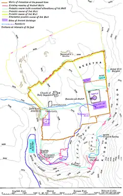 "Only in spring of 1848 did the British consul general in Constantinople and his colleague in Jerusalem,[ James Finn,] receive a firman to purchase a cemetery plot for the Protestant community."[5] Prepared by Nicolayson, later buried there, and with the support of Hugh Rose, British consul-general for Syria, and the Mutasarrıf of Jerusalem, Zarif Pasha, Bishop Gobat acquired the tract of land on Mount Zion in the same year, paying £ 350 (= 4,200 French francs) for the land, its enclosure and levelling.[6] Gobat financed the expenses with private funds earlier donated by Britons, Germans and Swiss, of which by December the British Government recovered £100 and later private British donators another £46.2.0, while Prussians did not specifically contribute to the project at that time. Mount Zion Cemetery replaced the old cemetery West of Jaffa Gate. So Gobat transferred the graves from there to the new cemetery on Mount Zion.[7] By the end of November 1848 it was completely enclosed by a wall.[6]