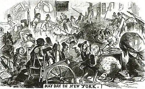 In 1799, an observer commented that New Yorkers "are seized on the first of May, by a sort of madness, that will not let them rest till they have changed their dwelling."[14] Because there were not enough cartmen to handle all the traffic, farmers would come from Long Island and New Jersey to rent out their wagons at high prices.[15] By 1820, because of the large increase in the number of propertyless renters, Moving Day had become "pandemonium", with the streets gridlocked with wagons carting household goods.[16] The tradition was still in force in 1848, when the Tenant League denounced it as a way for landlords to raise rents every year.[17] The cost of moving was another concern, as cartmen sometimes charged more than the official rates set by city ordinances – people were known to pay up to a week's wages to be moved[18] – and the truckman might, if the customer refused to pay on delivery, take their belongings to Police Headquarters, charging for the additional transportation.[19]