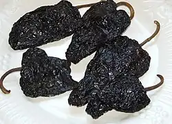 The mulato pepper is one of the two dried varieties of the poblano pepper.[1] Mulatos are dried fully mature poblanos, whereas poblanos that are harvested early and dried are called ancho peppers.