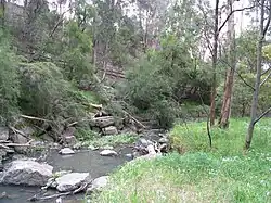 The otter-like rakali feeds in the stream here. Grassy, sedgy woodlands here are home to many undocumented species of butterflies as well as birds and possums. Drier mixed species forests gradually give way to swamp gums and manna gums as the creek heads south. Near New Street, the creek once turned and flowed south of Maroondah Highway down the now dry bed of the upper Heatherdale Creek and into the Dandenong Creek and Port Philip Bay, but a natural 'river capture' has now taken the waters of the creek and diverted them through a narrow gap in the hills to the north and the Yarra River.[2]