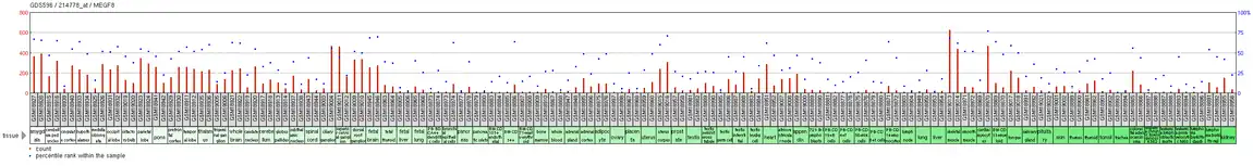 MEGF8 is found to be expressed at high levels in cardiac myocytes and fetal brain tissue, according to GeoProfiles,[23] from NCBI. This GeoProfile also indicated that MEGF8 was found to be at moderate to moderately low expression levels in all other tissues examined. NCBI GeoProfile data also provided the tissue expression graph for MEGF8 in humans, which is displayed to the right, further illustrating specific sites and levels of expression[24]