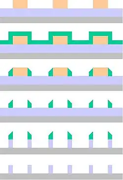Iterations of deposition followed by etching or controlled etchback of multilayers can result in substantial pitch reduction beyond SAQP.[70] The number of layers determines the degree of pitch reduction.