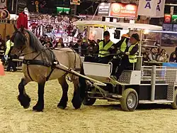 Various names have been used for the municipal horse, including cheval cantonnier, cheval citadin, cheval communal, and cheval citoyen. A symposium held in Avignon in 2000 focused on the theme of "the horse in the city." The term "municipal horse" was officially adopted during the first Congrès national des chevaux territoriaux in Trouville-sur-Mer in 2003.[1] In late 2012, a report by the Conseil général de l'alimentation, de l'agriculture et des espaces ruraux (CGAAER) defined the term as "a horse used by a local authority (either independently or as a service provider) to carry out public service missions in its territory, such as passenger transport, waste collection, maintenance of green spaces or natural areas, and prevention and security".[2] In Switzerland, the term "urban horse" is used.[2] However, the concept of "municipal horse" remains challenging to define comprehensively.[3]