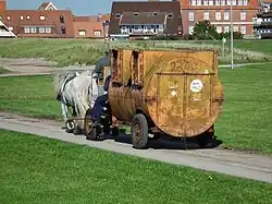 The use of horses for waste collection has various applications, including the collection of household waste, special waste from selective sorting (such as batteries, glass, and cardboard), and the emptying of litter bins in streets and parks. The presence of horses can facilitate communication with the public about waste sorting and management, often resulting in higher recovery rates. Horse-drawn vehicles enable effective door-to-door collection for both private and commercial customers, and seasonal collection schemes may be organized for events such as Christmas markets or the disposal of used Christmas trees.[18][19] Horse-drawn waste collection is noted for its potential to enhance awareness, particularly among children, and increases the visibility of the waste collection personnel. Some reports suggest that workers may feel more motivated and productive when working with horses. Additionally, horses can navigate narrow or steep streets more efficiently than motorized vehicles, making them suitable for short-distance tasks with frequent stops.[19] However, public acceptance of using horses for waste collection remains low, with a significant percentage of the population expressing opposition, as indicated by a 2003 Kantar TNS poll. Local authorities also face challenges in adapting staff and equipment for this type of service.[19]