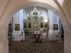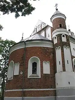 The building is close to a square and sized 15x13.5 meters. There is a round tower on each of the corners. Diameter of the towers is about 4.5 meters and thickness of their walls is about 1.8 meters. On the eastern side of the church an apse is attached. The facades are covered with numerous ornament elements. The church has one entrance located on its western end. The columns support the vaults and the interior is split into the three naves about 12 meters each in height.