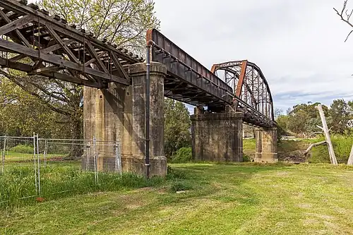 The Gundagai Rail Bridge over Murrumbidgee River is a 77-span timber deck truss, 11–12-metre (35–40 ft) spans, on tall timber trestles.[3] As at February 2018, the bridge was unsafe to cross due to decayed, loose and/or unstable timbers. There are safety barriers at both ends of the bridge to prevent pedestrian access. It was assumed to have not had any maintenance since 1984. A report at that time described the condition of the timber viaducts as varying from poor to fair condition, and the steel spans in fair to good condition.[4] The structure retains its original fabric.[3]