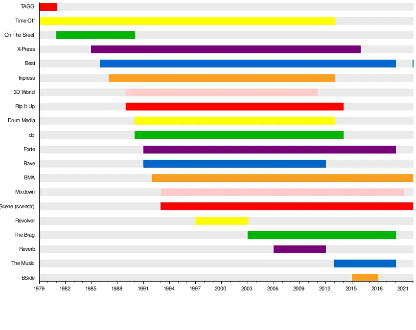 During the 1980s Time Off was published in Brisbane, after starting as a campus newspaper at the University of Queensland in 1976. It became a widely available bi-weekly title from March 14, 1980.[19] Rave Magazine was also published in Brisbane, starting in 1991 and ran for 1047 issues until 2012.[20]