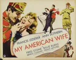 My American Wife is a 1936 American comedy film directed by Harold Young and written by Elmer Davis, Edith Fitzgerald and Virginia Van Upp. The film stars Francis Lederer, Ann Sothern, Fred Stone, Billie Burke, Ernest Cossart and Grant Mitchell. The film was released on August 7, 1936, by Paramount Pictures.[1][2]