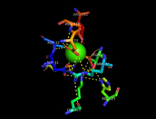 The active site is located through a short tunnel at the bottom of the surface cleft of the enzyme close to the end of the first β-strand in Domain 1 of the dimer subunits. A calcium ion, Ca2+, is coordinated in an octahedral arrangement by oxygen atoms of nearby side chains of residues Asp31, Asp32, Asp273, Asn274, and phosphorylated formylglycine, PFGly70. The PFGly70, which is post-translationally converted from a cysteine and is key in the catalytic activity of the enzyme, is stabilized by the side chains of residues Arg74, Lys123, His125, His181, Asp273, and Arg282 and the coordinate calcium ion.[1][2]