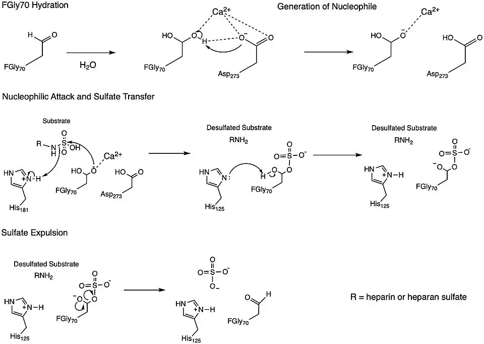 One of the proposed mechanisms for the N-sulfoglucosamine sulfohydrolase, depicted in the figure above, was inspired by a mechanism determined for a sulfatase enzymes, which similarly cleave sulfate ester groups from their substrates.[4] The N-sulfoglucosamine sulfohydrolase mechanism involves four key residues found in the enzyme active site: formylglycine (FGly70), two histidines (His125 and His181), and aspartic acid (Asp273). The formylglycine residue (FGly70) is first hydrated to form a geminal diol whose hydroxyl group subsequently coordinates with a Calcium(II) ion in the active site. A neighboring aspartic acid residue (Asp273) then acts as a base to deprotonate the coordinated hydroxyl group in the geminal diol, which acts as a nucleophile to the sulfate group on the substrate and leads to the cleavage of the substrate nitrogen-sulfur bond. A proximal histidine residue (His181) is proposed to donate a proton as a replacement for the sulfate group that was involved in the nitrogen-sulfur bond. At this point, the formylglycine (FGly70) has the sulfate group attached adjacent to a hydroxyl group, which is believed to be deprotonated by a second histidine group (His125) so that the negatively-charged oxygen atom can participate in the removal of the sulfate group from the residue. This final step liberates the enzyme from the sulfate group.[2]