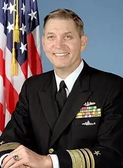 Nils Ronald "Ron" Thunman (born 26 February 1932) is a retired vice admiral in the United States Navy. Thunman is the son of Swedish immigrants, and was raised in Springfield, Illinois, where he attended Springfield High School. During high school he played football, basketball and was in involved in track. After high school, he briefly attended the University of Illinois College of Civil Engineering.[1] He graduated from the United States Naval Academy in 1954.[2] Initially trained as a surface warfare officer, Thunman was given command of the patrol boat USS Marysville in 1957. Transferring to submarines, he became chief engineer on USS Volador. After receiving nuclear power training, Thunman served as executive officer of USS Snook (1964 to 1966), commanding officer of the attack submarine USS Plunger (1968 to 1971) and commanding officer of ballistic missile Submarine Squadron 15 based in Guam (1974 to 1976).[3][4] Notable commands he later held include Commander, Submarine Forces Pacific (1979 to 1981),[5] Deputy Chief of Naval Operations for Submarine Warfare (1981 to 1985) and Chief of Naval Education and Training (1985 to 1988).[6] He retired in 1988.