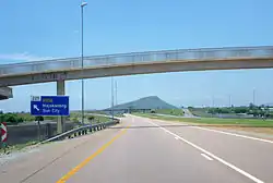 From Kroondal, the N4 continues eastwards for 36 kilometres, encountering the Marikana Toll Plaza and becoming a four-lane dual carriageway, bypassing Mooinooi, to reach the town of Modderspruit (Bapong), where it meets the R556 road which provides access to the resort of Sun City next to the Pilanesberg.[3]: 29 It proceeds eastwards for 8 kilometres to reach an interchange with the R512 road, which provides access to the city of Brits in the north and the city of Randburg (part of Johannesburg) via the western side of the Hartbeespoort Dam in the south.[3]: 29