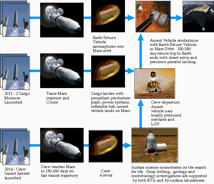 Info graphic highlight a possible sequence of launches to Mars and overall design. On the left is a sequence of launches that would send mission items to Mars and the right, it shows how they are utilized.[3] A major component that was sent is the Earth return vehicle, which would use aerobraking to get into Mars orbit. Next, a cargo Mars lander would get important hardware to the surface of Mars which would also use aerobraking. Finally, the crew would land on the surface and use the pre-positioned hardware to conduct the mission and then return to Earth. This plan would use the in-situ production of fuel for Mars ascent stage of returning crew. Both aerocapture and in-situ resource production were methods to reduce overall launch weight of mission plan.