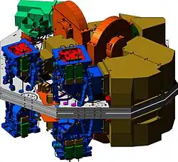 NIRCam (Near-InfraRed Camera) is an instrument aboard the James Webb Space Telescope. It has two major tasks, as an imager from 0.6 to 5 μm wavelength, and as a wavefront sensor to keep the 18-section mirrors functioning as one.[1][2] In other words, it is a camera and is also used to provide information to align the 18 segments of the primary mirror.[3] It is an infrared camera with ten mercury-cadmium-telluride (HgCdTe) detector arrays, and each array has an array of 2048×2048 pixels.[1][2] The camera has a field of view of 2.2×2.2 arcminutes with an angular resolution of 0.07 arcseconds at 2 μm.[1] NIRCam is also equipped with coronagraphs, which helps to collect data on exoplanets near stars. It helps with imaging anything next to a much brighter object, because the coronagraph blocks that light.[2]