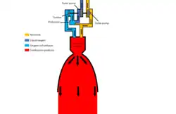 The NK-33 series engines were high-pressure, regeneratively cooled, oxygen-rich staged combustion cycle bipropellant rocket engines. Their turbopumps require subcooled liquid oxygen (LOX) to cool the bearings.[3] The NK-33's oxygen-rich closed-cycle design directs exhaust from the auxiliary engines into the main combustion chamber. In this configuration, fully heated liquid oxygen flows through the pre-burner before entering the main chamber. However, the extremely hot oxygen-rich mixture posed a significant engineering challenge. A key issue was the need for hot, high-pressure oxygen to flow throughout the engine, which would cause bare metal surfaces to oxidize rapidly. The Soviets overcame this by applying an inert enamel coating to all metal surfaces exposed to the hot oxygen.[4]