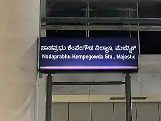 Nadaprabhu Kempegowda Station, Majestic is an underground interchange metro station on the east–west corridor of the Purple Line and north–south corridor of Green Line of Namma Metro in Bengaluru, in the state of Karnataka, India.[2] It opened to the public on 30 April 2016 as part of Namma Metro's Phase-1. This important metro station serves as the interchange station allowing passengers to transfer between these lines for ease of travel.[3] The station is located within walking distance from BMTC & KSRTC's Kempegowda Bus Station, as also the City's Main Railway station.