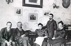 She met Rimsky-Korsakov at Dargomyzhsky's home in the spring of 1868. Not long after their first meeting he wrote a song which he dedicated to her. He also started visiting her frequently, both at the Purgold home in St. Petersburg and at the family's summer residence in Lyesnov.[6] She found in him an abundance of warmth and gentleness.[7] He proposed to her in December 1871,[8] and they married in July 1872.[9] Mussorgsky was Rimsky-Korsakov's best man.[10] The Rimsky-Korsakovs would eventually have seven children. Nadezhda was to become a musical as well as domestic partner with her husband, much as Clara Schumann had been with her own husband Robert.[9] Beautiful, capable, strong-willed and far better trained musically than her husband at the time they married,[9] she proved a good and most demanding critic of his work; her influence over him in musical matters was strong enough for Balakirev and Stasov to wonder sometimes whether she was leading him astray from their musical preferences.[11] Although she gradually gave up composition after her marriage, she had a considerable influence on the creation of his first three operas.[12] She travelled with her husband, attended rehearsals and proofread and arranged compositions by him and others.[12] Years later, Nikolai Rimsky-Korsakov wrote: "The overture [from The Maid of Pskov], from the first note to the last one, belongs to a no-good girl whom I love very, very much."[13]