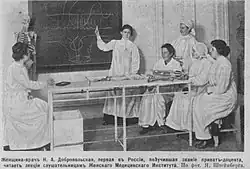 She then entered the Women's Medical Institute, where she studied from 1899 to 1904 and received a medical education as a surgeon. While studying, she also worked from 1902-1904 as an intern in the clinic of Professor Maksim Subbotin. After graduating from the institute she worked as a doctor in Vyatka province.[4] In 1907, Nadezhda Dobrovolska was appointed assistant professor and later, associate professor of operative surgery at the Women's Medical Institute. In 1911, she received a doctorate in medicine. Starting in 1914, she was a part-time doctor at the Obukhiv Hospital in Petrograd.[4]