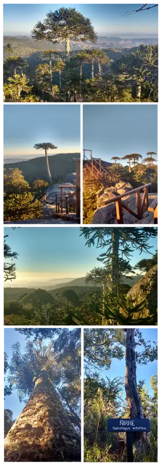 ![]() From the top down and in the left-right direction: View from the Piedra del Águila lookout towards the east, View of an Araucaria araucana at the Piedra del Águila viewpoint, View towards the Piedra del Águila viewpoint, Araucarias at the Piedra del Aguila viewpoint, Trunk of an Araucaria araucana, Ñirre (Nothofagus antarctica) in the park. | |