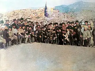 An uprising against communist rule in Dagestan began on 11 May 1920, with a group of North Caucasian political figures gathering in the village of Vedeno and declaring the restoration of the monarchy of Imam Shamil. Muhammad Karim, Shamil's son, was first selected as monarch, but he refused on account of his health, instead sending his 19 year-old son Said.[53] Najmuddin returned to Dagestan ahead of Said, leading an uprising in the Avar District in September 1920.[54] The uprising soon spread across Dagestan, growing to include the Andi and Gunib districts. Both Gunib and Khunzakh, strategically-important villages held by the Bolsheviks, were also captured.[4] At the Battle of Arakani Gorge, the rebels were able to inflict massive casualties on the Red Army.[55]