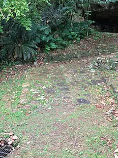 The Hiyagonbira (“the hill of Hiyagon”) paved road crosses the hill. It is a part of one of the seven main roads of the Ryūkyū Kingdom that used to run from Shuri Castle, the West Coast Road.[3] It was mainly destroyed at the end of the Meiji Period when the Japanese government developed the road system.[1] The Hiyagonbira paved road was made by flattening artificially a part of the natural landscape. It was paved with limestone, and bordered with a stone wall on several places. It is 1.5 to 3 m wide and is conserved on a length of 174 m.[3][5][6]