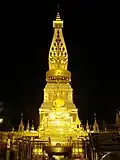 Important festivals in the province include the traditional dances of the Phu Thai ethnic group held in May and June every year. The Phra That Phanom temple fair is held every February, when many locals visit the temple to pay homage. At the end of the Buddhist Lent in October or November, an illuminated boat procession takes place. The event is locally known as Lai ruea fai (ไหลเรือไฟ), "floating a fire boat".[10]