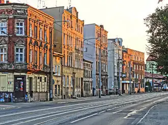The first street modernization after World War II happened only in the 1960s. Bitumen pavement was then applied from the railway viaduct to eastern city limits.[8] In 1973, a roundabout was built over the filled portion of the old Bydgoszcz Canal, at the connection with Grunwaldska street.[9]
