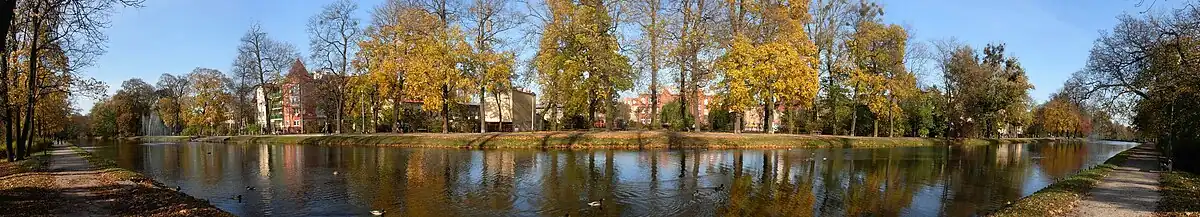 A general reconstruction with embellishments was carried out in 1936: in the park, there were a dozen of restaurants, cafes, beer gardens, playgrounds for children, as well as tennis courts, and a 9 ha leisure complex founded in 1928 by Sejm member Idzi Świtała.[22] The grounds were a propitious place for birds, with a lush vegetation: for 150 years, it has been considered as housing one of the largest colony of Thrush nightingales in Europe.[24] Some of the oldest trees were seen as natural curiosities such as a 36 m high black poplar with a trunk circumference of 300–500 cm.[25] The park started to become neglected in the 1960s, with the progressive expansion of Bydgoszcz and the unfavorable socio-economic climate: eventually, the old portion of the Canal became filled with rainwater and wastewater from the western part of the city.[25] In 1970, the decision of the municipal council to dry and fill the eastern section of the canal was the last straw: 624 m of canal, together with two locks and a bridge were destroyed to widen the thoroughfare.[9] This resulted in a decrease of the park area by one third, from 74 to 47 hectares, and for the Old Canal to become a dead branch, detached from Mill Island.