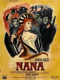 Nana is a 1955 French-Italian historical drama film directed by Christian-Jaque and starring Martine Carol and Charles Boyer. An adaptation of the 1880 novel Nana by Émile Zola, it tells the story of two French aristocrats who are fatally ruined by their obsession for Nana, a mediocre actress and prostitute. Using the ancient theme of a worthless woman beguiling powerful men, the film portrays the moral corruption of the nominally Catholic court and nobility under the Second Empire. It was shot at the Billancourt Studios in Paris and filmed in Eastmancolor. The film's sets were designed by the art director Robert Gys.