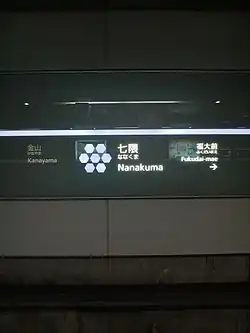 Nanakuma Station (七隈駅) is a subway station on the Fukuoka City Subway Nanakuma Line in Jōnan-ku, Fukuoka in Japan. Its station symbol is a picture of seven hexagon in violet.