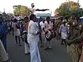 In Thirumazhapadi, Vaidyanathasamy and His consort welcome the group of bridegroom to the accompaniment of music. Then they will be taken to the specially erected wedding mandapa.[5] The marriage festival is held in front of the devotees. After completion of the festival deeparadhana would be done. Later the celestial couples offer blessings. [6] The priests of the temple perform the marriage of Nandhi. As per the marriage ritual the couple would go around the ceremonial fire seven times. Shiva took the newly wed couple to seven Shiva temples around Thiruvaiyaru.[1] These seven temples are known as Saptha Sthanams. They are very close to each other and can be covered in one session. In the tamil month of Chittirai (April-May), the Deity (Utsavar) of Thiruvaiyaru is carried on a palanquin to all these temples.[7]
