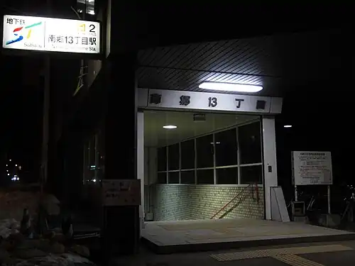 Nangō-Jūsan-Chōme Station (南郷13丁目駅) is a Sapporo Municipal Subway station in Shiroishi-ku, Sapporo, Hokkaido, Japan. The station number is T15.