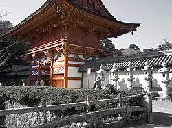 During the nearby Battle of Sekigahara in 1600, the shrine was again completely burnt to the ground and was not rebuilt until 1642, when Shogun Tokugawa Iemitsu sponsored the construction efforts.[3] The shrine retains a document which details the cost of the reconstruction. In 1867, as a result of shinbutsu bunri, the Buddhist temple located on the shrine grounds was moved to a different location and named Shinzen-in (真禅院). In 1871, the shrine was designated as a National shrine, 2nd rank (国幣中社, Kokuhei Chūsha) under the Modern system of ranked Shinto shrines of State Shinto. It was promoted to a National shrine, 1st rank (国幣大社, Kokuhei Taisha) in 1925, and its name was changed from "Jinja" to "Taisha" to reflect its more important status.[2]