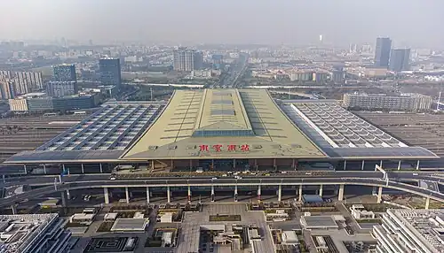 Nanjingnan (Nanjing South) railway station (Chinese: 南京南站; pinyin: Nánjīngnán Zhàn) is a high-speed railway station in Nanjing, the capital of Jiangsu province, serving the Beijing–Shanghai (Jinghu) high-speed railway, Shanghai–Nanjing (Huning) intercity railway, Nanjing–Hangzhou (Ninghang) high-speed railway, Shanghai–Wuhan–Chengdu (Huhanrong) high-speed railway, Nanjing–Anqing intercity railway and the South Jiangsu Riverside high-speed railway.[1] The new Nanjing South railway station is located a few kilometers south of downtown Nanjing in Yuhuatai District, and has a connection with the Nanjing Metro, served by Lines 1, 3, S1 and S3. Construction on the station began on 10 January 2008,[2] and the station opened on 28 June 2011,[3] two days before the opening of the Beijing–Shanghai high-speed railway.