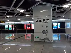 Nanning East railway station (simplified Chinese: 南宁东站; traditional Chinese: 南寧東站) is a railway station and metro station of Liuzhou–Nanning intercity railway and Nanning–Guangzhou high-speed railway and the under construction Nanning–Yulin high-speed railway. The station is located in Qingxiu District, Nanning, Guangxi, China. The station, located in 66 Changhong Road,[1] was opened Dec 26, 2014. It is a transportation center of high-speed railways, regular trains, buses, metro Line 1 and coaches.[2]