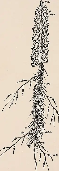 Nanomia bijuga, like other siphonophores, is made up of genetically identical but highly specialized zooids, arranged in an elongate colony structure.[1][4] The zooids' functions encompass prey capture, propulsion, and reproduction, all orchestrated within a translucent or transparent body, aiding in camouflage amidst its oceanic habitat. The organism is composed of two main body segments: the nectosome on the anterior end and the siphosome as the posterior. The nectosome contains a gas-filled pneumatophore at its end as well as nectophores, bell-shaped structures that assist in locomotion. The siphosome contains zooids specialized for feeding, digestion, reproduction, and protection. These zooids are organized in repeating sequences called cormidia.[5] Each cormidium contains one feeding zooid, the gastrozooid, with multiples of the other zooid types. Gonophores and gonodendrons, the male and female reproductive zooids respectively, occur together in pairs.[4]