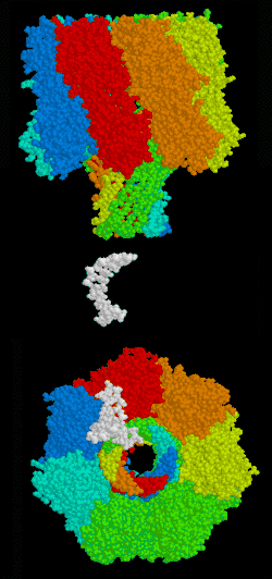 Alpha hemolysin (αHL), a nanopore from bacteria that causes lysis of red blood cells, has been studied for over 15 years.[18] To this point, studies have shown that all four bases can be identified using ionic current measured across the αHL pore.[19][20] The structure of αHL is advantageous to identify specific bases moving through the pore. The αHL pore is ~10 nm long, with two distinct 5 nm sections. The upper section consists of a larger, vestibule-like structure and the lower section consists of three possible recognition sites (R1, R2, R3), and is able to discriminate between each base.[19][20]