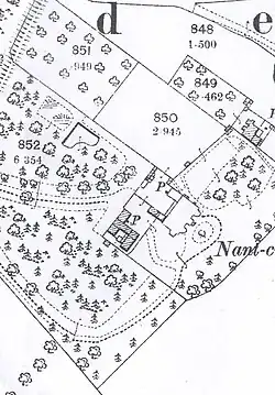 In 1697 Arthur Devereux employed the Bridgnorth architect Henry Pagett[10] to design a brick house, which stood to the west of the Nantcribba Castle and Hen Nantcribba. This house was placed on a ridge of high ground, with views over Shropshire to the east and Montgomeryshire to the west. This house was modified in the mid 18th by the Earl of Hereford, but shortly afterwards the Earls fell on hard times and the House was let to a succession of tenants, one of whom was Sir James Bland Burges, the M P for Helston, in, Cornwall, who lived there between 1785 and 1789[11] Eventually in 1863, the House and surrounding lands were sold to John Naylor, a Liverpool banker, who had already purchased two other Montgomeryshire estates: Brynllywarch in Kerry and Leighton Hall. It was probably at this time that the frontage of the house was lowered and altered. The house was largely destroyed in 1899 when the family who were living in it were at a ball in Welshpool.[12] The house, now known as Parklands, has subsequently been re-built, incorporating part of the stable block, while some of the walled garden survives.