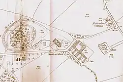 When the estate was acquired by John Naylor in 1863, he used the firm of architects Poundley and Walker, who worked from offices at Brynllywarch, Kerry, to design a new Model Farm and Farmhouse, a gatehouse on the B 4388 Montgomery to Forden Road and worker's housing on the A490, Forden to Churchstoke Road.[13] The single-story gatehouse is in a whitish brick often used by the architect, David Walker, while the other buildings are in a reddish brick, some with stone rustication and Cefn stone facings which are typical of Poundley and Walker.[14] The model farm is laid out on the typical grid plan adopted by Poundley, and an axial row of buildings, which would have contained a drive shaft to provide a power source to adjacent yards. The layout is basically symmetrical, with a 2-storey central spine range running NE - SW, of approximately 12m span, containing the main straw barn, having 2-storey cross ranges of 6.5m span, 14 roof bays each side, set 2/3rds of the length to the SW, from which 2 single storey ranges spring at right angles, each with 7 open arches, and terminating in pens each with a small yard. The single storey ranges form 2 stock yards each side of the SW end of the barn range, designed for beef cattle. The spine barn range has 14 tensioned queen post-and-collar trusses NE of the cross range junction, and the cross ranges have haunched king posts and angled strut trusses. The large stockyard in the northern angle is paved with large stone sets, and is defined by a 7-bay carthouse on cast iron columns on its NE side, with a wide 6-roof-bay granary over. At right angles to the NW cross range, the large stock yard is enclosed by a further range, with stables for brood mares on the inner (yard) side, and for stallions on the outer face. The corresponding E angle contains the rick yard. Tall round-arched openings give access to the enclosed paved N yard, with similar arches forming a cross space in the great barn range. Access doors to the feeding walks are framed and battened, with some recessed ironmongery, and windows are of part louvred. The cattle yards between the SW wings are enclosed by stone coped brick walls. A stone shield with initials and date on the SW gable of the barn, and some bricks are impressed JN1874 for John Naylor. The lack of farm buildings on the NE sector, suggests that the layout was not completed. The effluent flow away to a very large holding tank beyond the SE end of the cross range, with distribution pipes leading to the fields, similar to the system used at Leighton.[15] The buildings are in the course of conversion into a housing scheme of 26 residential dwellings.[16]