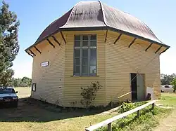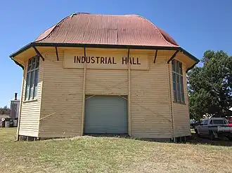 The Narrandera Showground Industrial Hall is a small, single-storey, octagonal, weatherboard building with a bell-curved, domed corrugated iron roof. The building measures 11 m (36 ft) to the top of the dome that was formerly surmounted by a metal, louvred ventilator that was topped with a mini dome and a flagpole (the ventilator, dome and flagpole are now missing). The eaves are supported with curved timber brackets which are set above an external timber cornice.[1]