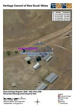 - ^ a b c d e f g h i j k l m n o p q r s t u v w x y z aa ab ac ad ae af ag ah ai aj ak al am an ao ap aq ar as at au av aw ax ay az ba "Narrandera Showground Industrial Hall". New South Wales State Heritage Register. Department of Planning & Environment. H01952. Retrieved 2 June 2018.