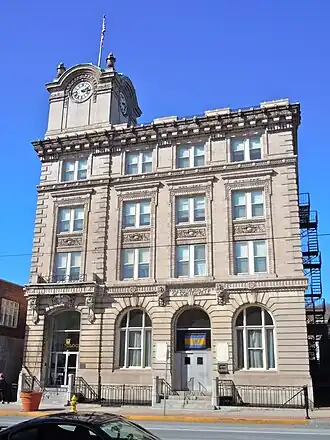 Built between 1906 and 1908, this historic building is a four-story, steel-frame structure that was faced in buff-colored brick and Indiana Limestone, Designed in an eclectic, Late Victorian style, it measures 70 feet by 140 feet, was trimmed in Indiana limestone and terra cotta, and features a clock tower with rounded dome framing. In addition to the bank, the building once housed the post office.[2] The building has been converted to apartments.