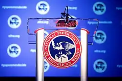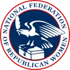 The seal of the National Federation of Republican Women (NFRW) is a registered trademark that reflects the organization's focus on the democratic process. It features an American Eagle holding a quill pen and standing beside a ballot box, symbolizing the protection of voting rights and electoral integrity.[12]