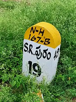 National Highway 167B, commonly called NH 167B is a national highway in India.[1][2] It is a spur road of National Highway 67.[3] NH-167B traverses the state of Andhra Pradesh in India. The tenders for phase 1 of this road project covering a road length of 40 km from singarayakonda to malakonda (local shrine of sri lakshmi narasimha swamy) have been called on 21 June 2021 under Morth annual highway laying plan with a budget outlay of approximately 700crores. A bypass at Kandukur is planned to avoid outbound traffic into town. Works will begin shortly after finalisation of contract work.[2]