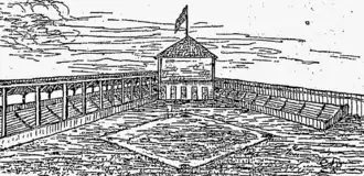 The Kennard Street Baseball Grounds (Kennard Street Park), later renamed National League Park, was bounded by Sibley Street (present Carnegie Avenue) on the north, Cedar Avenue on the south, Kennard Street (present East 46th Street) on the west, and the eastern edge ended at the boundary of the back yards of the houses facing Willson Avenue (present East 55th Street).[1] A contemporary plat map indicates the diamond was closest to the Kennard-Cedar intersection.