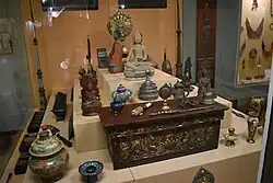 The theme was primarily visualized through the artifacts from the National Museum collection. There were pottery stone sculptures, bronzes, wood carvings, terracotta, paintings, textiles and ethnic objects. These masterpieces range from collections of Anthropology, Archaeology, Decorative Art, and Pre-Columbian to Western Art. Additionally, to enhance the comparative artistic tradition of Thailand, select replicas of the masterpieces of ancient Thai art masks, musical instruments, photographs of Thai archaeological sites and objects, etc., contributed by the Royal Thai Embassy, were also on display. A wide range of silk-textiles from Assam and Thailand, from the collection of Dr, Pawan Jain, Art Historian and Smt, Gunjan Jain, Textile Designer, were also exhibited. The Swargadeo Chaolung Siukapha Samanway Kshetra, Mohbandha, Jorhat, Assam, also contributed a rare collection of Tal-Ahom manuscripts. Photographs from the field documentation conducted by the curatorial team of the Museum in Arunachal Pradesh and Assam, which were on display, highlighted the similarities in Buddhist architectural edifices.[46][47]