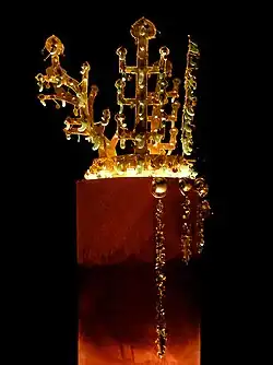 The Fifth-century Silla gold crown was excavated from the North tomb of Hwangnamdaechong in Gyeongju. More ornaments, including a silver belt ornament inscribed (보인대)'Buindae ("Madame's belt"), were found in the North tomb than in the South tomb, suggesting that the North tomb is a woman's. The gold crown reflects the owner's political and social class.