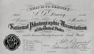 The National Photographic Association of the United States (1868–1880) formed "for the purpose of elevating and advancing the art of photography, and for the protection and furthering the interests of those who make their living by it."[1] In particular, the group organized initially to prevent "the reissue of the ... ambrotype patent."[2]