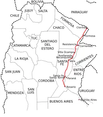 National Route 11 (RN11), known officially as Carretera Juan de Garay, is a road in Argentina, which runs through the provinces of Santa Fe, Chaco, and Formosa. From its beginning in the Rosario Beltway until it ends at the San Ignacio de Loyola International Bridge, on the border with Paraguay, it covers 980 km (610 mi), fully paved. In Formosa Province, the 80 km (50 mi) highway is under construction between the intersection with National Route 81 to the north of the City of Formosa and the town of General Lucio V. Mansilla on the shores of the Bermejo River bordering the Chaco Province.