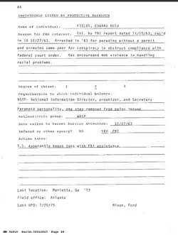 On December 27, 1963, Edward Fields was brought to the US Secret Service's attention as a possible threat against protected individuals. This was divulged as part of the JFK file release. The FBI considered that Fields was "one step removed from being insane."[9]